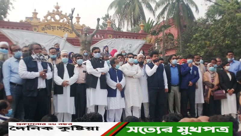 কুষ্টিয়ায় বঙ্গবন্ধুর ভাষ্কর্যে ভাচুরের প্রতিবাদে শহরে বিশাল বিক্ষোভ মিছিল হয়েছে। শনিবার বিকেল ৪টায় কুষ্টিয়া পৌরসভার সামনে থেকে বের হওয়া বিক্ষোভ মিছিলে যোগ দেন আওয়ামী লীগের যুগ্ম সাধারণ সম্পাদক মাহবুবউল আলম হানিফ এমপি। এর আগে দলে দলে আওয়ামী লীগ ও এর সহযোগী সংগঠনের নেতাকর্মীরা সেখানে এসে জড়ো হয়। মিছিলটি ভাংচুরকৃত ভাষ্কর্যস্থল হয়ে শহরের প্রধান সড়ক এনএস রোড প্রদক্ষিন করে বড় বাজারে গিয়ে শেষ হয়। বিক্ষোভ মিছিলে শিবির ও মৌলবাদীদের বিরুদ্ধে বিভিন্ন স্লোগান দেয় নেতাকর্মীরা। কুষ্টিয়ার কুমারখালী খোকসা আসনের সংসদ সদস্য ব্যারিষ্টার সেলিম আলতাফ জর্জ, জেলা আওয়ামীলীগের সভাপতি, সাধারণ সম্পাদকসহ বিভিন্ন পর্যায়ের নেতাকর্মী ও নাগরিক সমাজের ব্যানারে বিভিন্ন সামাজিক সাংস্কৃতিক সংগঠনের প্রতিনিধি নারী ও পুরুষ অংশ নেন।