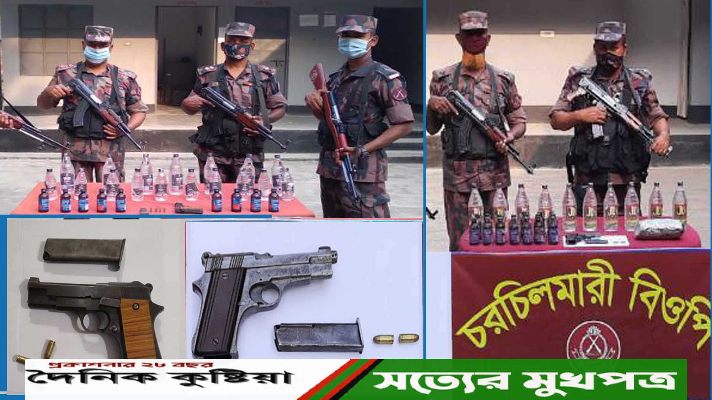 ২১ মার্চ ২০২১ কুষ্টিয়া জেলার দৌলতপুর উপজেলায় আলাদা অভিযানে দুটি বিদেশি পিস্তল, গুলি ও মাদকদ্রব্য উদ্ধার করেছে বিজিবি। ৪৭ বিজিবি কুষ্টিয়া ব্যাটালিয়নের এক সংবাদ বিজ্ঞপ্তিতে বলা হয়েছে, ২০ মার্চ দিবাগত রাত দেড়টার দিকে চরচিলমারী সীমান্ত পিলার ১৫৭/২-এস হতে ৩০০ গজ বাংলাদেশের অভ্যন্তরে মালিকবিহীন অবস্থায় একটি বিদেশী পিস্তল, একটি ম্যাগাজিন, দুই রাউন্ড গুলি, ১০ বোতল মদ, ১৭ বোতল ফেন্সিডিল এবং ৫০০ গ্রাম গাঁজা পাওয়া যায়। টহল কমান্ডার সুবেদার মোঃ সবুর সিকদার এ অভিযান পরিচালনা করেন। অপর অভিযানে দৌলতপুরের প্রাগপুর মাঠ থেকে একটি বিদেশি পিস্তল, ৪ রাউন্ড গুলি, ১৭ বোতল মদ, ৯ বোতল ফেন্সিডিল মালিকবিহীন অবস্থায় পাওয়া যায়। এ অভিযান পরিচালনা করেন, নায়েব সুবেদার জাকির হোসেন।