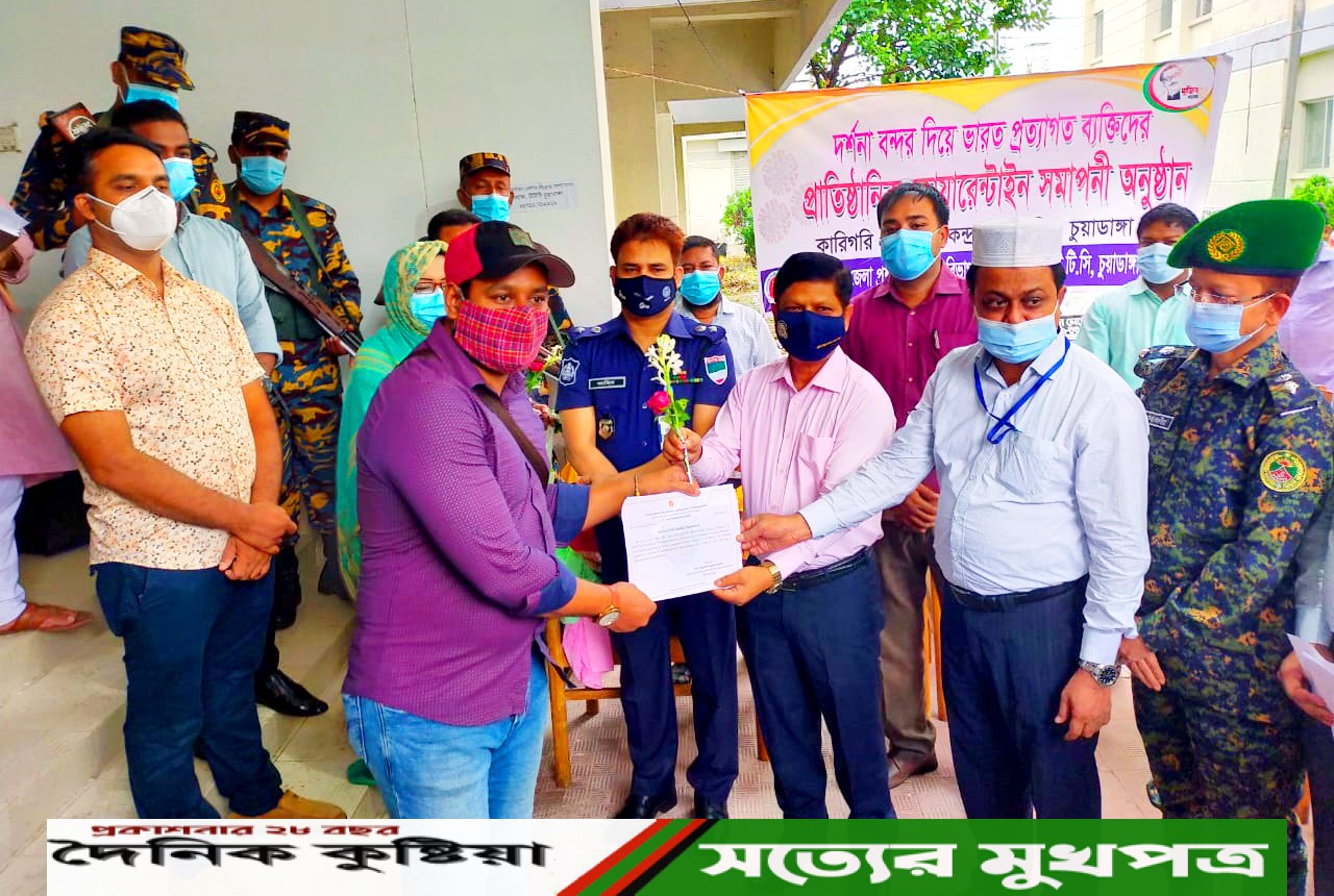 এরআগে চুয়াডাঙ্গায় ১৪ দিন কোয়ারেন্টিন শেষ করার পর বাড়ি ফিরেছেন ভারত ফেরত ১১ জন যাত্রী। সকালে ঘরে ফেরা এসব যাত্রীদের ফুল দিয়ে বিদায় জানান চুয়াডাঙ্গা জেলা প্রশাসক নজরুল ইসলাম সরকার, পুলিশ সুপার জাহিদুল ইসলাম, সিভিল সার্জন ডা. এএসএম মারুফ হাসান, জেলা আনসার ও ভিডিপি’র কমান্ড্যান্ট আলমঙ্গীর হোসেনসহ প্রশাসনের অন্যান্য কর্মকর্তারা। ১৪ দিনের কোয়ারেন্টিন শেষে বাড়ি ফেরা যাত্রীদের করোনা নেগেটিভ সার্টিফিকেট ও কোয়ারেন্টিন প্রত্যয়নপত্র দিয়েছে জেলা প্রশাসন। গত ১৭ মে ভারতে আটকা পড়া এসব বাংলাদেশী দেশে প্রবেশ করে।ন গতকাল রোববার শেষ হয় তাদের ১৪ দিনের প্রাতিষ্ঠানিক কোয়ারেন্টিন।