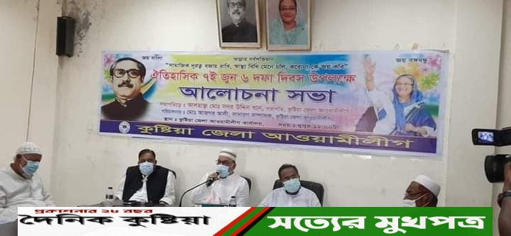 কুষ্টিয়া জেলা আওয়ামীলীগের উদ্যোগে ঐতিহাসিক ৭ই জুন ৬ দফা দিবস পালিত হয়। প্রথমে হাজার বছরের শ্রেষ্ঠ বাঙালী জাতির জনক বঙ্গবন্ধু শেখ মুজিবুর রহমান এর ম্যুরালে (কুষ্টিয়া সরকারি কলেজের সামনে) কুষ্টিয়া জেলা আওয়ামী লীগের পক্ষ থেকে পুষ্পস্তাবক অর্পনের মাধ্যমে গভীর শ্রদ্ধাঞ্জলি জানানো হয়। এরপর কুষ্টিয়া জেলা আওয়ামী লীগের কার্যালয়ে আলোচনা সভা অনুষ্ঠিত হয়। এতে সভাপতিত্ব করেন জেলা আওয়ামী লীগের সভাপতি আলহাজ সদর উদ্দিন খান। সভা পরিচালনা করেন সাধারণ সম্পাদক বীর মুক্তিযোদ্ধা আজগর আলী। বক্তব্য রাখেন সহ-সভাপতি, জেলা পরিষদ কুষ্টিয়ার চেয়ারম্যান হাজী রবিউল ইসলাম। এছাড়াও বক্তব্য রাখেন, জেলা আওয়ামীলীগের সহ সভাপতি জাহিদ হোসেন জাফর, শেখ গিয়াস উদ্দিন আহমেদ মিন্টু, আলহাজ্ব মতিয়ার রহমান মজনু, চৌধুরী মুরশেদ আলম মধু, হাবিব উল্লাহ, নাসির উদ্দিন আহমেদ, যুগ্ম সাধারন সম্পাদক স্বপন কুমার ঘোষ, কোষাধ্যক্ষ অজয় সুরেকা, দপ্তর সম্পাদক হাজী তরিকুল ইসলাম মানিক, মুক্তিযুদ্ধ বিষয়ক সম্পাদক মানিক কুমার ঘোষ, যুব ও ক্রীড়া সম্পাদক খন্দকার ইকবাল মাহমুদ, তথ্য ও গবেষনা সম্পাদক হাজী রাশেদুল ইসলাম বিপ্লব, বিজ্ঞান ও প্রযুক্তি সম্পাদক মমিনুর রহমান মমিজ, শ্রম বিষয়ক সম্পাদক গোলাম মোস্তফা, মহিলা বিষয়ক সম্পাদিকা শিলা বসু প্রমুখ।