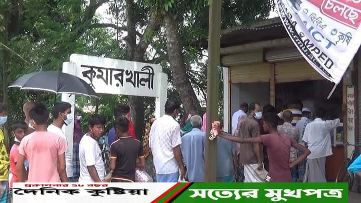 কুষ্টিয়ার কুমারখালীতে সরকারী খাদ্য সহায়তা প্রকল্পের আওতায় ওএমএস এর চাল ও আটা বিক্রি শুরু হয়েছে। গতকাল থেকে তিনজন ডিলারের মাধ্যমে পৌরসভার মধ্যে এই বিক্রয় কার্যক্রম আরম্ভ হয়েছে। সোমবার তিনটি বিক্রয় কেন্দ্র ঘুরে দেখা যায় কোন নিয়মের তোয়াক্কা না করে ক্রেতাদের উপচে পরা ভীড়। কেউ মানছেনা স্বাস্থ্যবিধি।
