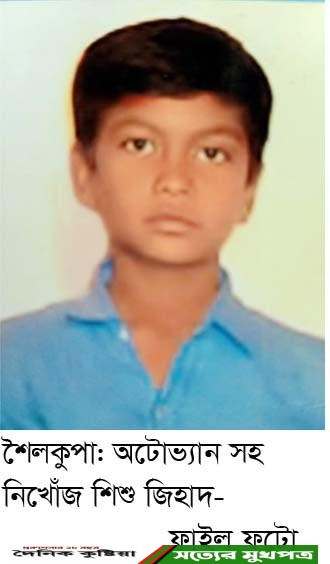 অটোভ্যান সহ নিখোঁজ হয়েছে জিহাদ হোসেন নামের এক শিশু(১২)। ঘটনাটি ঝিনাইদহের শৈলকুপার ২নং মির্জাপুর ইউনিয়নের রামচন্দ্রপুর গ্রামে। নিখোঁজ শিশু জিহাদ হোসেন রামচন্দ্রপুর গ্রামের হবিবর রহমানের ছেলে। এ ঘটনায় গত শনিবার শৈলকুপা থানায় জিডি দায়ের করেন শিশুটির পিতা। পুলিশের পক্ষ থেকে বলা হয়েছে শিশুটিকে উদ্ধারের জন্য তারা চেষ্টা চালিয়ে যাচ্ছেন ।নিখোঁজ শিশু জিহাদের পিতা হবিবর রহমান জানান, তার ছেলে জিহাদ গত শুক্রবার সকাল ১০টার দিকে অটোভ্যান নিয়ে পার্শ্ববর্তী শেখপাড়া বাজারের উদ্দেশ্যে যায়। তারপর থেকে তার আর কোন সন্ধান তারা পাননি। এরপর শনিবার তিনি শৈলকুপা থানায় একটি জিডি দায়ের করেন।রামচন্দ্রপুর পুলিশ ফাড়ির ইনচার্জ এসআই শামীম হোসেন জানান, তারা ঘটনাটি জানার সাথে সাথে শিশুটিকে উদ্ধারের জন্য চেষ্টা চালিয়ে যাচ্ছেন। শিশু নিখোঁজের ঘটনায় শৈলকুপা সার্কেলের অতিরিক্ত পুলিশ সুপার আরিফুল ইসলাম জানান, শুক্রবার সকাল ১০টার দিকে জিহাদ নামের এক শিশু একটি অটোভ্যান সহ নিখোঁজ হয়। পুলিশ নিখোঁজ শিশুটিকে উদ্ধারের জন্য আপ্রান চেষ্টা চালিয়ে যাচ্ছেন বলে জানান।