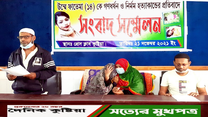 কুষ্টিয়ার মিরপুর বর্ডার গার্ড স্কুলের ৯ম শ্রেণির ছাত্রী উম্মে ফাতেমাকে (১৪) অপহরণ করে ধর্ষণের পর হত্যার ন্যায় বিচার চেয়েছেন তার পরিবার একই সাথে ঘটনাটি কেবলমাত্র হত্যা মামলা হিসেবে এবং এজাহারে বাদীর দেয়া আসামিদের নাম বাদ দিয়ে অজ্ঞাতদের বিরুদ্ধে মামলা রেকর্ড করার প্রতিবাদসহ জড়িতদের গ্রেফতার ও ন্যায় বিচার দাবি করে সংবাদ সম্মেলন করেছেন ভুক্তভোগী পরিবার।