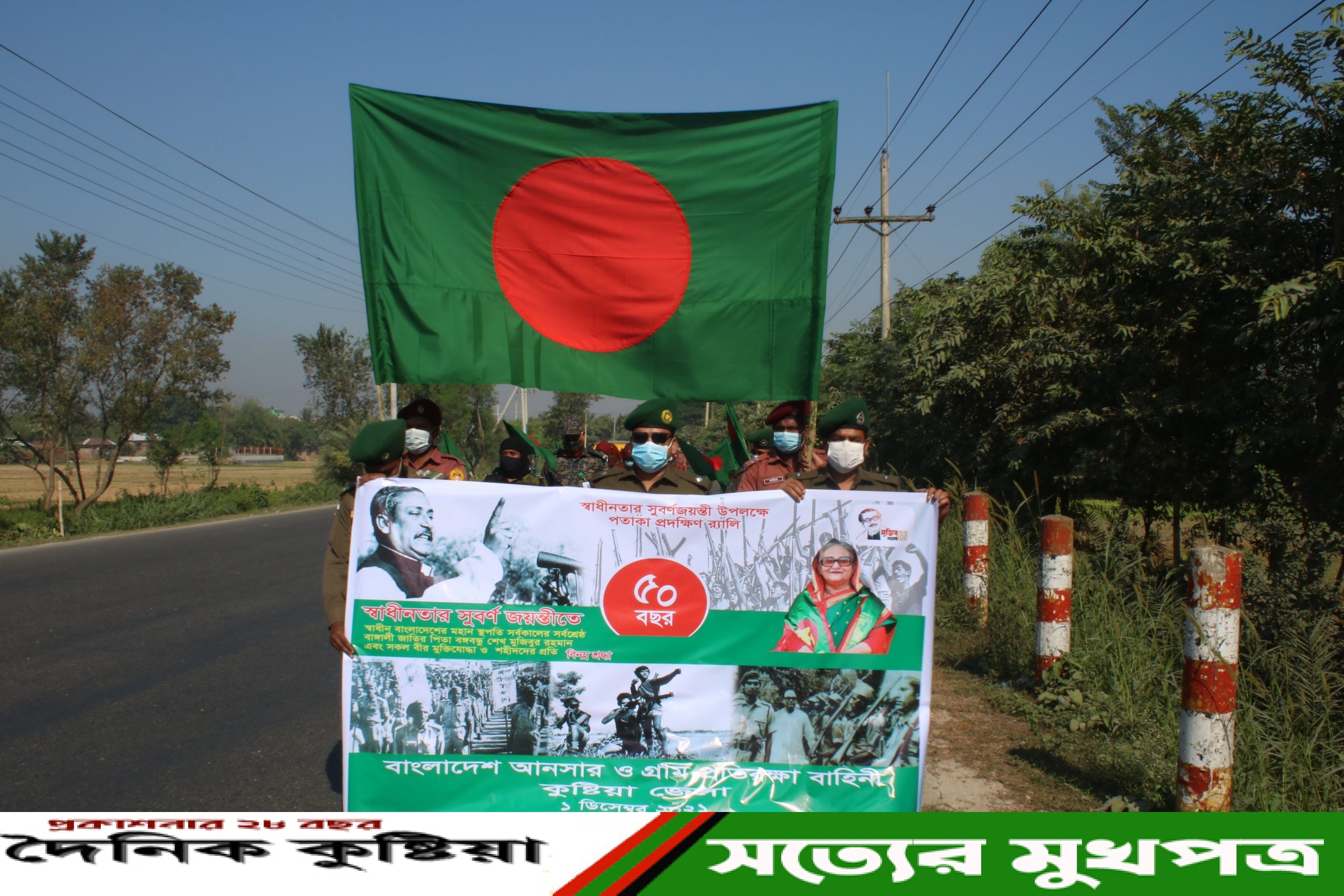 কুষ্টিয়া জেলা আনসার ও গ্রাম প্রতিরক্ষা বাহিনীর উদ্যোগে স্বাধীনতার সুবর্ণজয়ন্তী উপলক্ষে বাংলাদেশ আনছার ও গ্রাম প্রতিরক্ষা বাহিনীর সদরের কর্মসূচির অংশ হিসেবে কুষ্টিয়ায় জেলা আনসার বাহিনীর উদ্যোগে স্বাধীনতার সুবর্ণজয়ন্তীতে বিভিন্ন ধরনের কর্মসূচি করা হয়েছে। জানা যায়,মহান স্বাধীনতার সুবর্ণজয়ন্তী যথাযথ মর্যাদায় উদযাপন ( ২৬ মার্চ ২০২১ ইং থেকে ১৬ ডিসেম্বর ২০২১ পর্যন্ত) এর লক্ষ্যে বাংলাদেশ আনছার ও গ্রাম প্রতিরক্ষা বাহিনী কর্তৃক সদর দফতর একাডেমি রেঞ্জ, ৪২টি ব্যাটালিয়ন ও ৬৪ টি জেলা কার্য্যালয়ের তত্বাবধানে ৫০ জন বিভিন্ন পদবীর সদস্যের উপস্থিতিতে ৫০ মিনিট ধরে ৫০টি জাতীয় পতাকা নিয়ে একযোগে র্যালী করা হয়। বুধবার ১ ডিসেম্বর কুষ্টিয়া জেলায় আয়োজিত বর্ণাঢ্য র্যালীর শুভ উদ্বোধন করেন কুষ্টিয়া জেলা কমান্ড্যান্ট সোহেলুর রহমান। এসময় উপস্থিত ছিলেন উপজেলা আনসার ও ভিডিপি কর্মকর্তা শহীদুল ইসলাম, রেজোয়ান ইসলাম, উপজেলা প্রশিক্ষক বিপ্লব হোসেন ও বিভিন্ন পদবীর ব্যাটালিয়ন আনসার ও সাধারন আনসার সদস্যবৃন্দ। র্যালী শেষে আনসার কমান্ড্যান্ট সোহেলুর রহমান বলেন, মুজিব বর্ষ উপলক্ষ্যে বাংলাদেশ আনসার বাহিনীর মহাপরিচালক মেজর জেনারেল মিজানুর রহমান শামীম স্যারের সদয় নির্দেশনায় বাংলাদেশ আনছার বাহিনী বিভিন্ন ধরনের কার্যক্রম পরিচালনা করে যাচ্ছেন। আজকের র্যালীও সেই কার্যক্রমের অংশ হিসেবে পালিত হলো। প্রাণবন্ত র্যালী শেষে জেলা কমান্ড্যান্ট সোহেলুর রহমান উপস্থিত সকল সদস্য ও কর্মীদের প্রতি ধন্যবাদ জ্ঞাপন করেন।