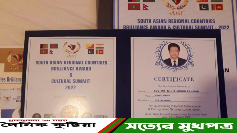 সার্ক ব্রিলিয়েন্স অ্যাওয়ার্ড” পেলেন কুষ্টিয়ার তরুণ সংগঠক অ্যাডভোকেট মুহাইমিনুর রহমান পলল