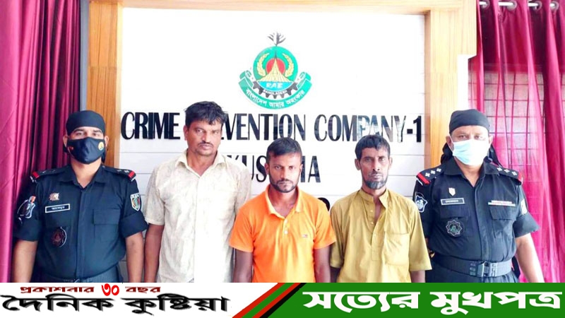 কুষ্টিয়া ক্যাম্পের কোম্পানী কোমান্ডার ক্সোয়াড্রন লিডার মোহাম্মদ ইলিয়াস খান জানান গ্রেফতারকৃতরা হলেন কুষ্টিয়া কুমারখালী উপজেলার কোমরকান্দী এলাকার মৃত আকরাম বিশ্বাসের ছেলে শহিদুল বিশ্বাস (৪৭), একই এলাকার মৃত আকবর শেখের ছেলে ছদ্দিন (৪০), এবং লাচেন জোয়াদ্দারের ছেলে রাশেদ জোয়াদ্দার (৩৫)।
