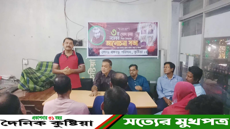 কুষ্টিয়া জেলা বঙ্গবন্ধু পরিষদের উদ্যোগে জেল হত্যা দিবস পালিত হয়েছে। দিবস উপলক্ষ্যে ৩ নভেম্বর সন্ধ্যায় দৈনিক কুষ্টিয়া অফিসে আলোচনা সভার আয়োজন করা হয়।