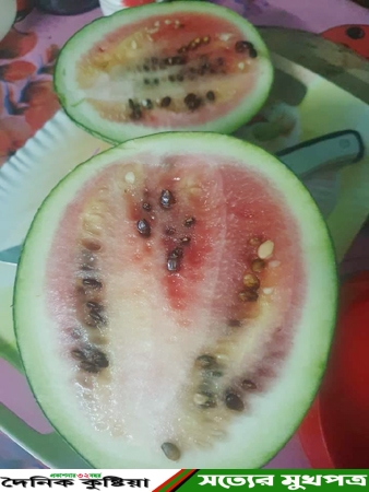 কুষ্টিয়ার প্রধান বাজার পৌর বাজারে পরিদর্শন করে দেখা গেছে, তরমুজ এবারও কেজি দরে বিক্রি হচ্ছে। কেজিতে দাম হাঁকা হচ্ছে ৭০ থেকে ৯০ টাকা পর্যন্ত। একটি দুই বা তিন কেজির তরমুজের গড় দাম পড়ছে ২১০ টাকা থেকে ২৭০ টাকা পর্যন্ত। এসব তরমুজ কেটে দেখা যাচ্ছে ভিন্ন চিত্র ভেতরের কোষগুলো ফাঁপা, শুকনো। লাল রঙ কেবলই ধরেছে। কোনটি আবার সাদা-লাল। কিছু কিছু তরমুজের স্বাদ মিষ্টি হলেও, বেশির ভাগই পানসে স্বাদের। কোষের ভেতরে কোন রস নেই। অথচ লাল রসই তরমুজের প্রধান উপাদান। একটি তিন কেজি ওজনের পাকা তরমুজ থেকে কমপক্ষে এক থেকে দেড় লিটার পিউর রস পাওয়া যায়।
