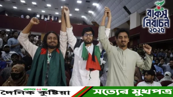 দৈনিক কুষ্টিয়া অনলাইন/ রাজশাহী বিশ্ববিদ্যালয়ের কেন্দ্রীয় ছাত্র সংসদ (রাকসু) নির্বাচন অনুষ্ঠিত হয়, এবং ২৩টি পদের মধ্যে ২০টিতে জয় অর্জন করেছে বাংলাদেশ ইসলামী ছাত্রশিবির সমর্থিত ‘সম্মিলিত শিক্ষার্থী জোট’ প্যানেল। বাকি তিনটি