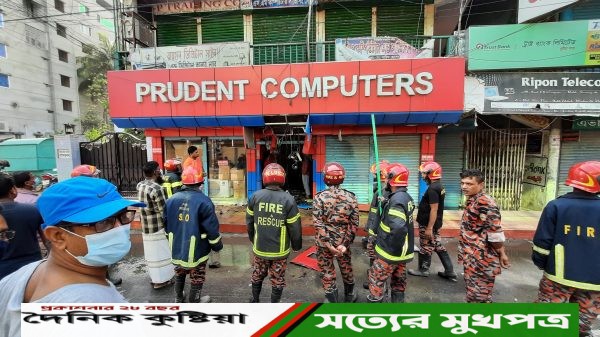 দৈনিক কুষ্টিয়া প্রতিবেদক/ অল্পের জন্য রক্ষা পেয়েছে কুষ্টিয়া শহরের থানা ট্রফিক মোড়ের তিনতলা কম্পিউটার মার্কেট শতাব্দী ভবন। ২২ এপ্্িরল সকাল ৭টার দিকে নিচতলার প্রুডেন্ট কম্পিউটারস এর বিশাল সাইনবোর্ডে বৈদ্যুতিক গোলযোগে
