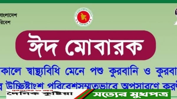দৈনিক কুষ্টিয়া প্রতিবেদক/ করোনাকালে স্বাস্থ্যবিধি অনুসরণ করে পশু কুরবানি ও কুরবানিকৃত পশুর উচ্ছিষ্টাংশ পরিবেশসম্মতভাবে অপসারণে দেশের জনগণের প্রতি পরিবেশ, বন ও জলবায়ু পরিবর্তন মন্ত্রণালয়ের আহবানঃ • করোনাকালীন পরিস্থিতিতে স্বাস্থ্য সুরক্ষার