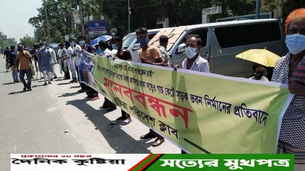 জাহিদুজ্জামান/ কুষ্টিয়ায় সড়ক বিভাগের সড়ক ভবন নির্মাণের জন্য বাগানের গাছ কাটার উদ্যোগের প্রতিবাদ জানিয়েয়েন পরিবেশবাদীরা। সড়ক বিভাগের কুষ্টিয়া অফিসের সামনে মহাসড়কে আজ বেলা সাড়ে ১০টায় মানববন্ধন করেন কয়েকশ পরিবেশবাদী। সম্মিলিত