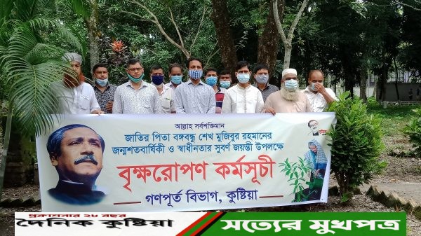 দৈনিক কুষ্টিয়া প্রতিবেদক/ গণপূর্ত বিভাগের অফিস চত্বরে সকাল ১১.৩০ ঘটিকার সময় জাতিরপিতা বঙ্গবন্ধু শেখ মুজিবুর রহমানের জন্মশতবার্ষিকী ও স্বাধীনতার সুর্বণ জয়ন্তী উপলক্ষে কুষ্টিয়া গণপূর্ত বিভাগের বৃক্ষ রোপন কর্মসূচি পালন করা