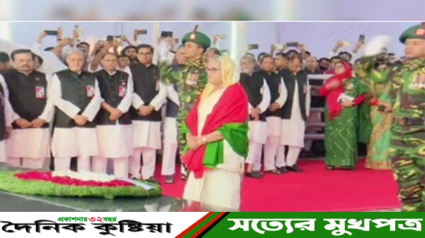 দৈনিক কুষ্টিয়া অনলাইন/ ঐতিহাসিক ৭ মার্চ উপলক্ষে জাতির পিতা বঙ্গবন্ধু শেখ মুজিবুর রহমানের প্রতিকৃতিতে শ্রদ্ধা জানিয়েছেন প্রধানমন্ত্রী শেখ হাসিনা। বৃহস্পতিবার (৭ মার্চ) সকাল ৭টায় ধানমন্ডি ৩২ নম্বরে ফুল দিয়ে শ্রদ্ধা